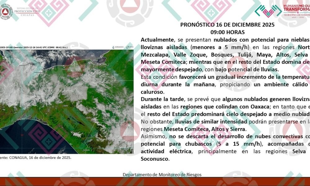 Leonor Hernández La Comisión Nacional del Agua (CONAGUA) y el Sistema Estatal de Protección Civil de Chiapas han emitido una alerta meteorológica para el estado de...