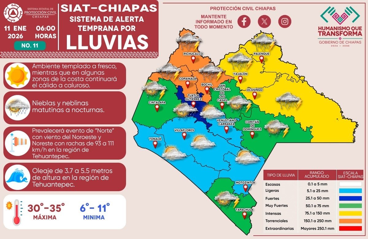 En este contexto, Protección Civil de Chiapas recomienda tomar precauciones y mantenerse informado a través de redes oficiales. Ante cualquier emergencia, se puede llamar al 9.1.1.