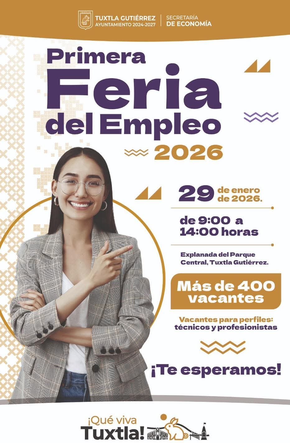 La feria se realizará el 29 de enero de 2026, en un horario de 9:00 a 14:00 horas, en la Explanada del Parque Central de Tuxtla Gutiérrez, donde se ofertarán más de 400 vacantes para perfiles técnicos y profesionistas. El Ayuntamiento reitera su compromiso de impulsar el empleo formal y acercar oportunidades para todas y todos.