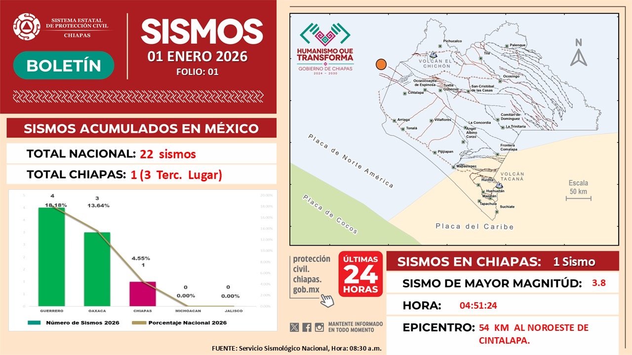Un sismo de magnitud 3.8 se registró a las 04:51 de este 1 de enero en Chiapas, con epicentro a 54km al Noroeste de Cintalapa., el movimiento telúrico se sintió en varias zonas del estado, aunque no se reportan daños materiales ni personas lesionadas., en este sentido la Secretaría de Protección Civil del Estado de Chiapas activó protocolos de emergencia para evaluar la situación.