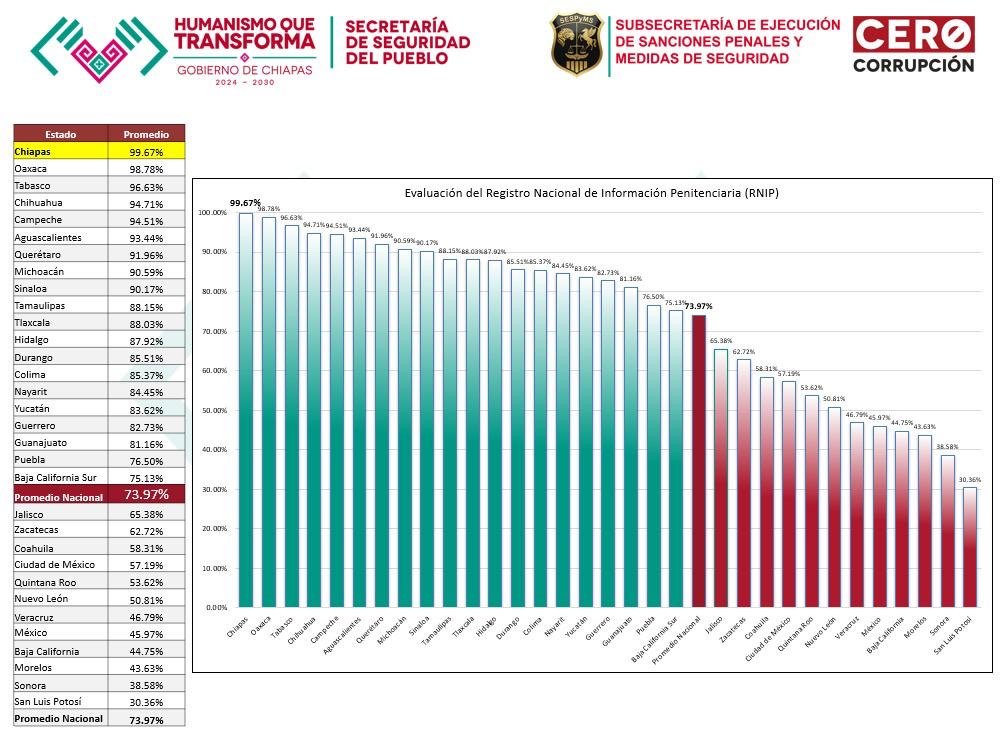 Con 99.67%, Chiapas obtuvo la calificación más alta alcanzada hasta el momento, en más de una década desde la creación del Registro Nacional de Información Penitenciaria (RNIP).