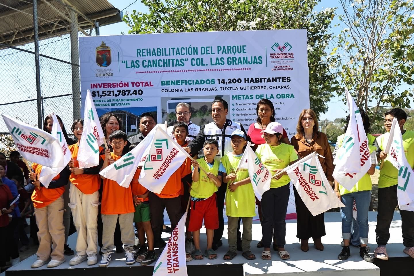 En Tuxtla Gutiérrez, el gobernador Eduardo Ramírez Aguilar encabezó el inicio del programa Transformando mi Espacio con Humanismo, con el arranque de los trabajos de rehabilitación del parque Las Canchitas, ubicado en la colonia Las Granjas. En el acto, destacó que el gobierno de la Nueva ERA promueve el mejoramiento integral de los espacios públicos como una vía para fortalecer la paz, el bienestar y el tejido social.