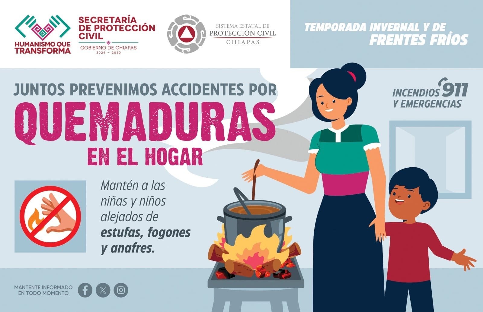 Según la Secretaría de Protección Civil, las quemaduras son una de las principales causas de lesiones en el hogar, especialmente durante la temporada invernal, cuando se utilizan más fuentes de calor. Para prevenir estos accidentes, se recomienda mantener a los niños alejados de áreas donde se utilicen fogones o estufas, y asegurarse de que los utensilios de cocina estén fuera de su alcance, etas acciones de concientización se han remarcado principalmente en zonas como San Cristóbal delas casas que por las bajas temperaturas se presentan dichas prácticas,.