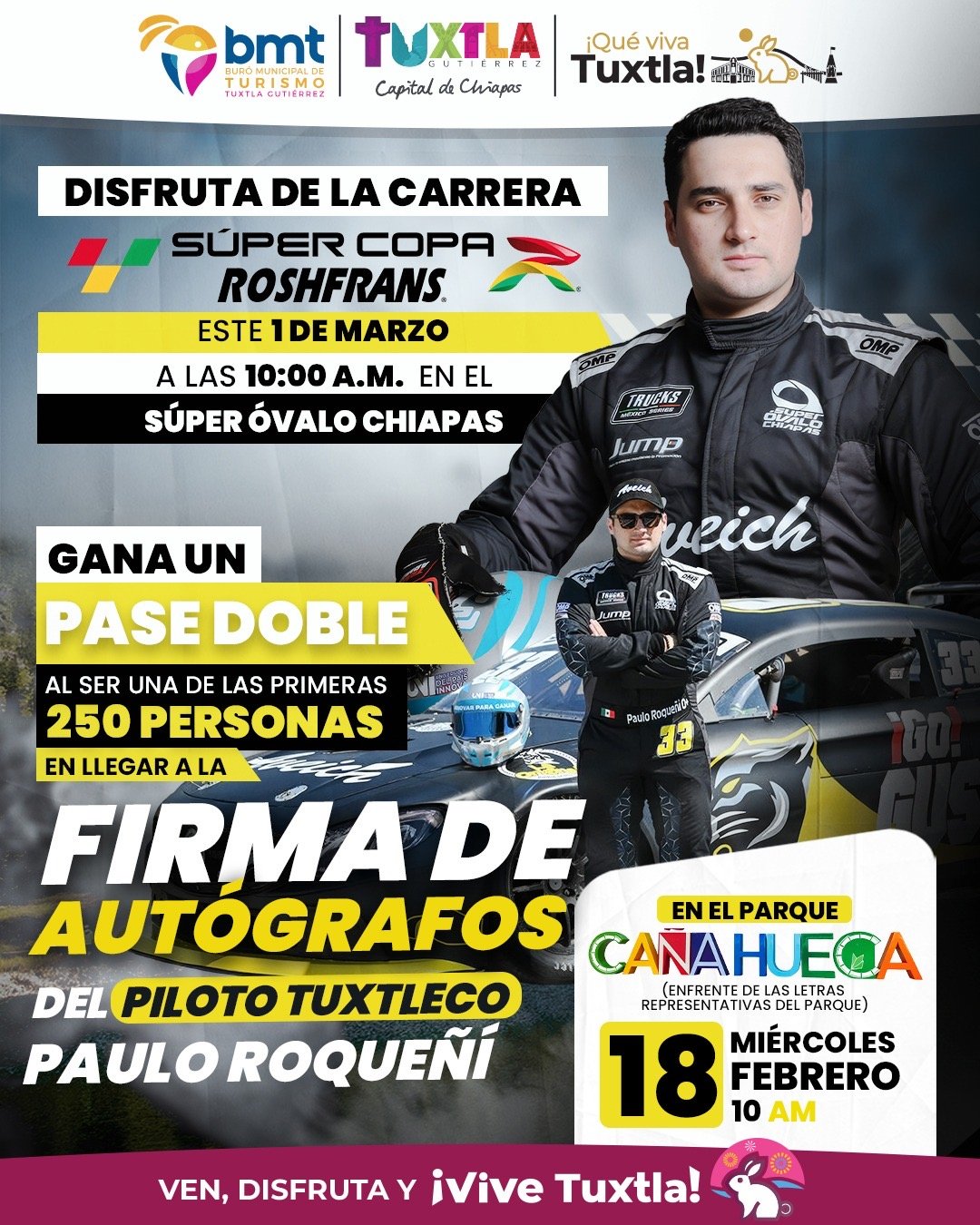 El Buró Municipal de Turismo invita a la ciudadanía a la firma de autógrafos con el piloto tuxtleco Paulo Roqueñí, MAÑANA MIÉRCOLES 18 DE FEBRERO, en el Parque Deportivo Caña Hueca, frente a las letras representativas del parque, a partir de las 10 de la mañana.